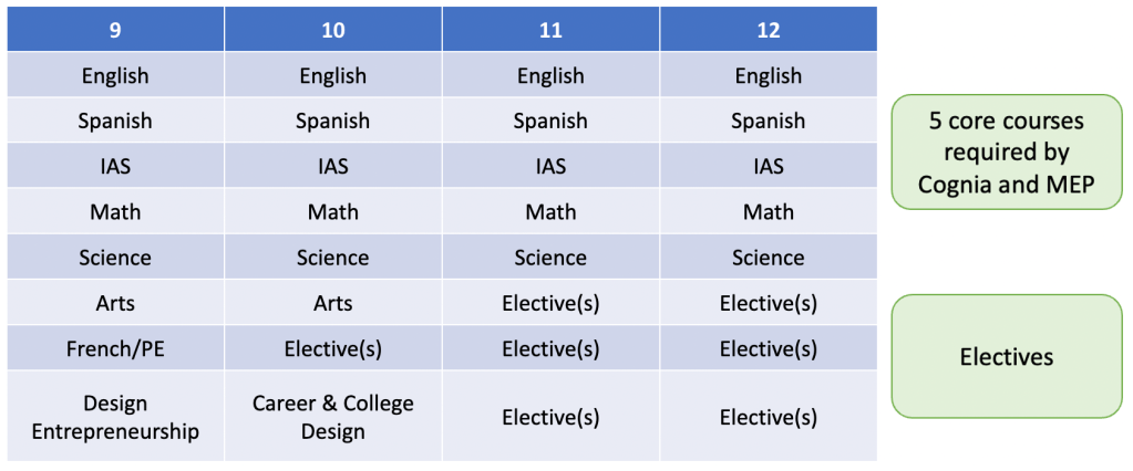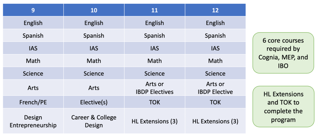 The Entrepreneurial Academy at Lincoln School will offer our high school students a matriculation pathway that is tailor-made to their college and career interests. Currently, our graduating 12th-grade students have the opportunity to earn up to three separate high school diplomas, one from MEP, one from Cognia, and one from the IBO. In general, they follow one of two pathways to those diplomas. Those who are attempting the IB Diploma follow a course sequence that looks something like this: