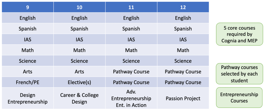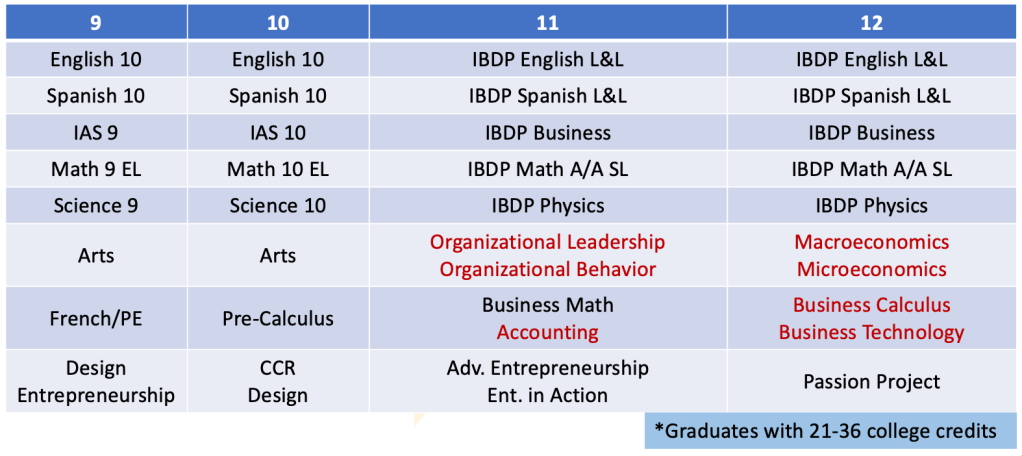 As you can see, students attempting the IB Diploma do not have room in their 11th and 12th grade schedules to attempt additional electives, while those not attempting the IB Diploma have room for quite a few. Our Entrepreneurial Academy will take advantage of those spaces in students’ schedules to offer discreet courses in entrepreneurship, leadership, and project management while also offering them space to develop their own projects and eventually even internships and work-study. Additionally, our counselors will work with students to fill out the rest of their schedules with specific courses aligned to their college and career plans. An Entrepreneurial Academy student’s schedule will look something like this: